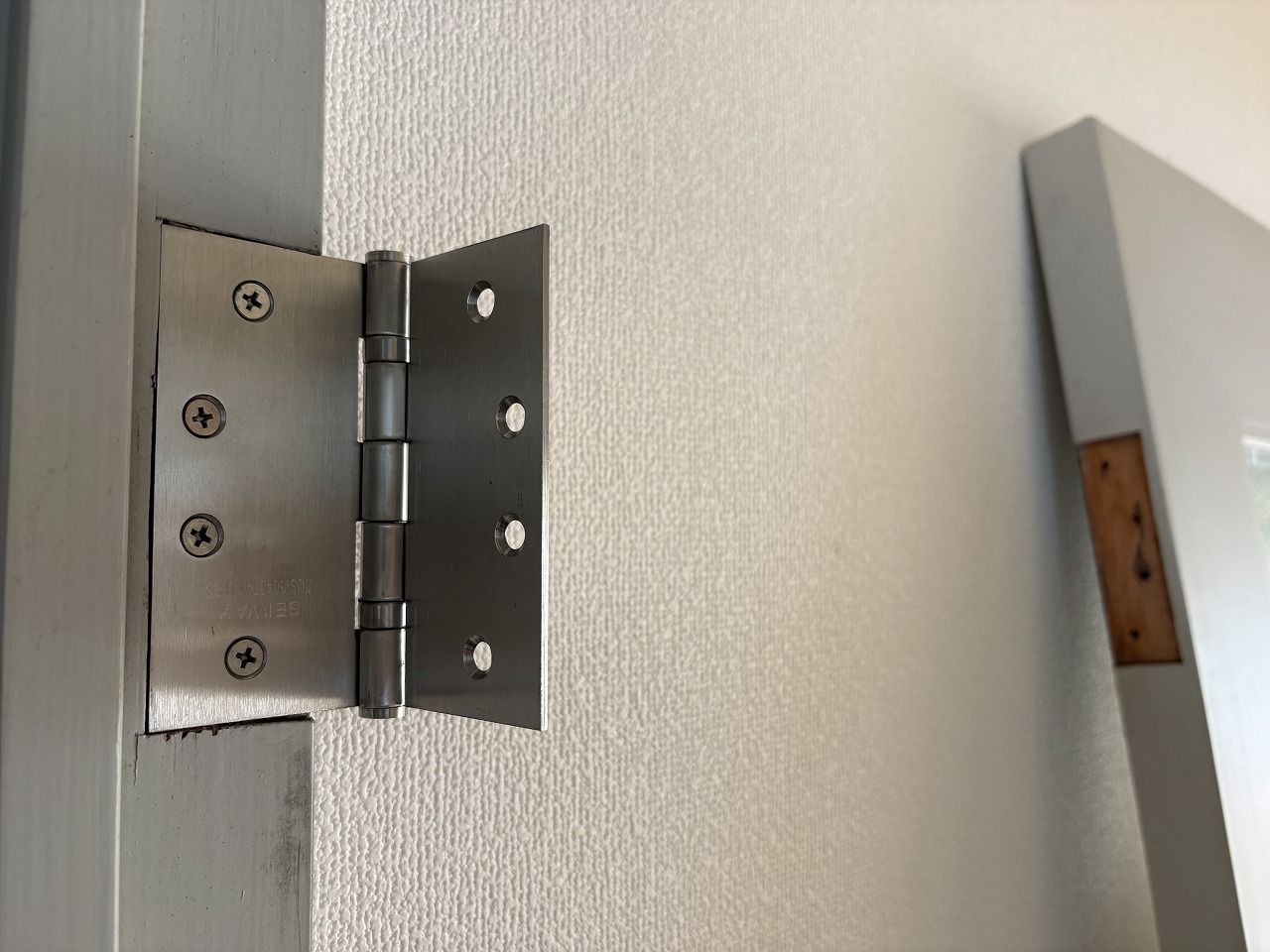 チーム犀北ハイツの内装屋さんに聞いたら、蝶番(ちょうつがい)を交換すればよいとアドバイスを頂き、さっそく直営工事を施工!!